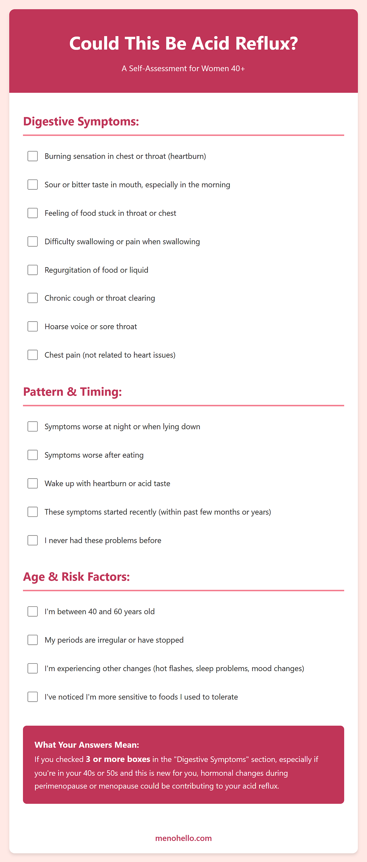 If you checked 3 or more boxes in the "Digestive Symptoms" section, especially if you're in your 40s or 50s and this is new for you, hormonal changes during perimenopause or menopause could be contributing to your acid reflux.