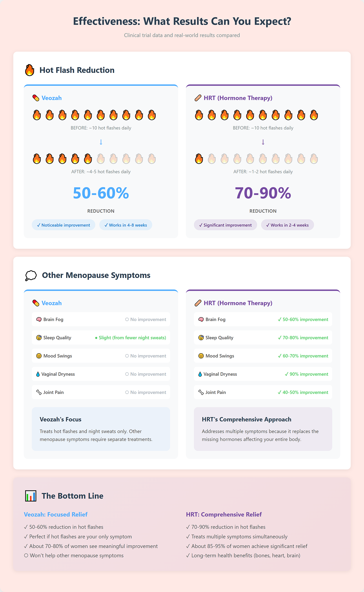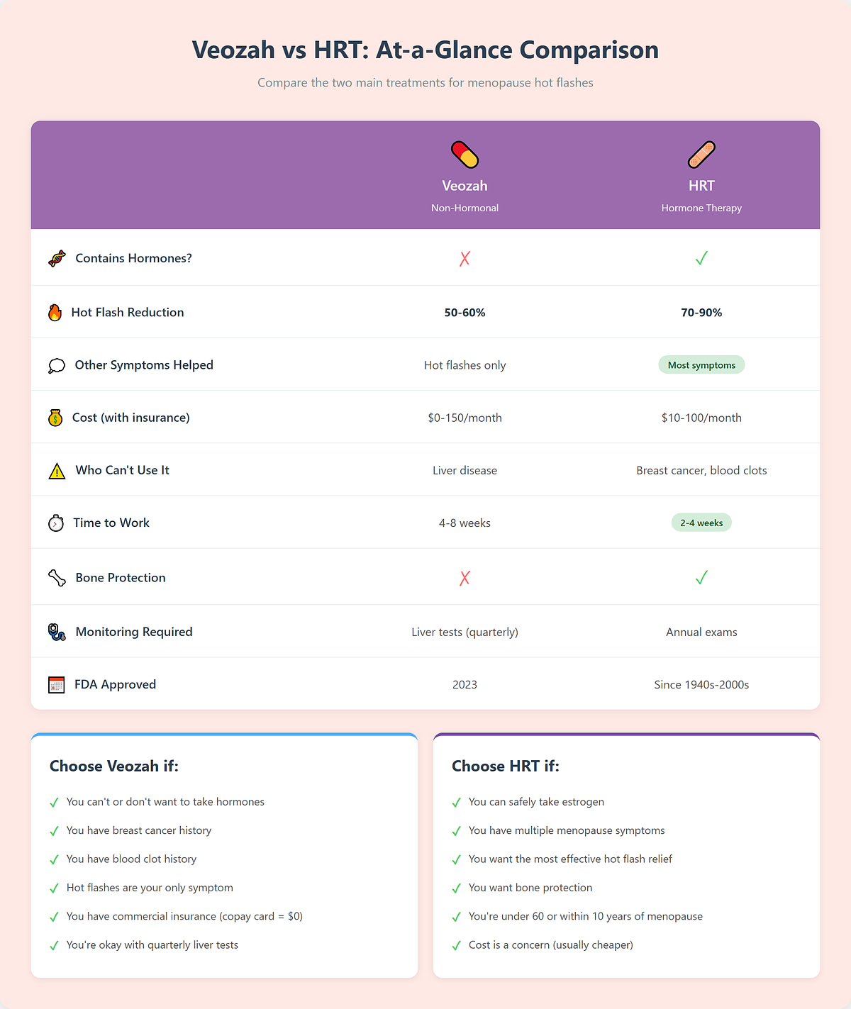 Here's what makes this decision so challenging: Both Veozah and HRT can dramatically reduce hot flashes. But they work completely differently, have different risk profiles, different costs, and work better for different women.